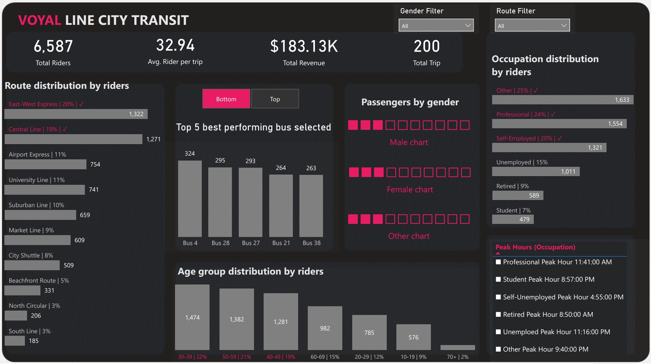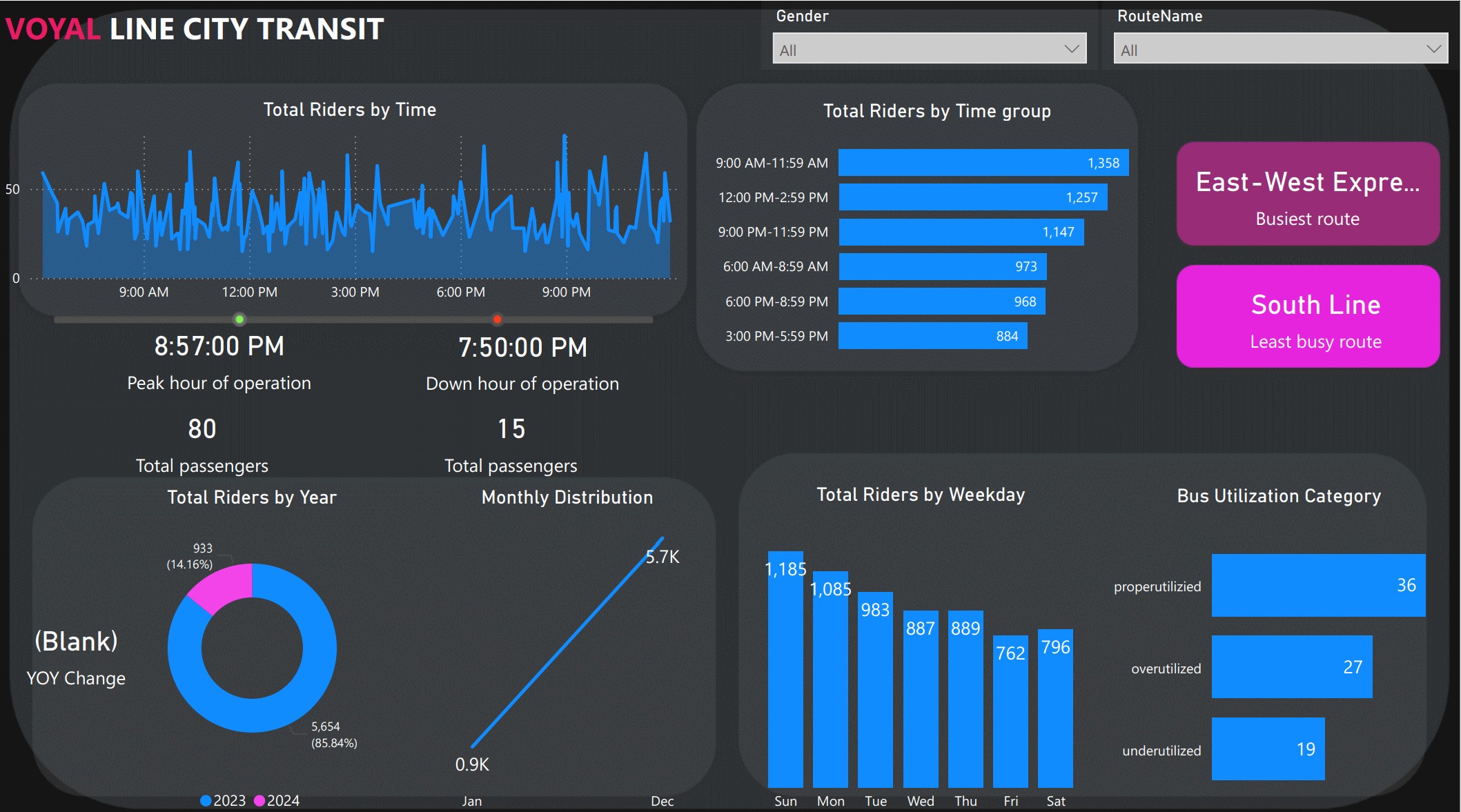 This project focuses on understanding the performance and utilization of the bus transportation system in Line City during December 2023. Key insights include rider demographics, route performance, and utilization patterns, enabling data-driven decisions for system optimization.