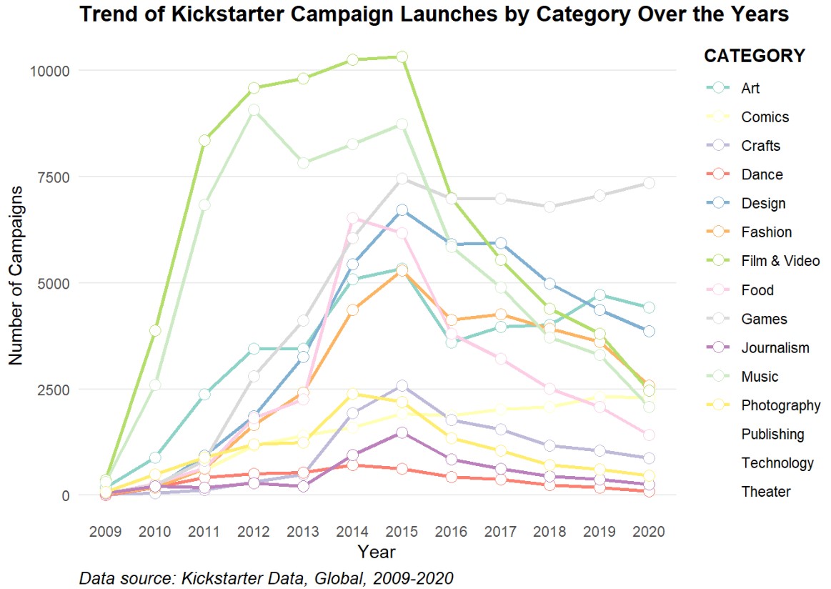 This project examines a dataset from Kickstarter, provided by Jonathan Leland through the Inter-university Consortium for Political and Social Research (ICPSR), to explore trends in crowdfunding campaigns from 2009 to 2020. We focused on identifying which types of projects attract the most and the least campaigns, observing how the number of campaigns has changed over time, and determining which categories are most likely to succeed or fail.