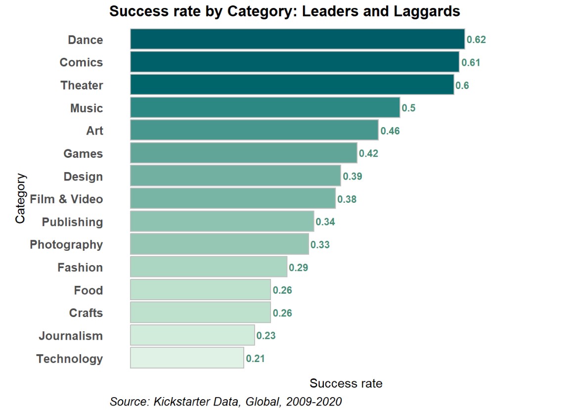 - Film & Video and Music categories dominated in campaign volume, while categories like Dance and Comics were less frequent but showed surprisingly high success rates.