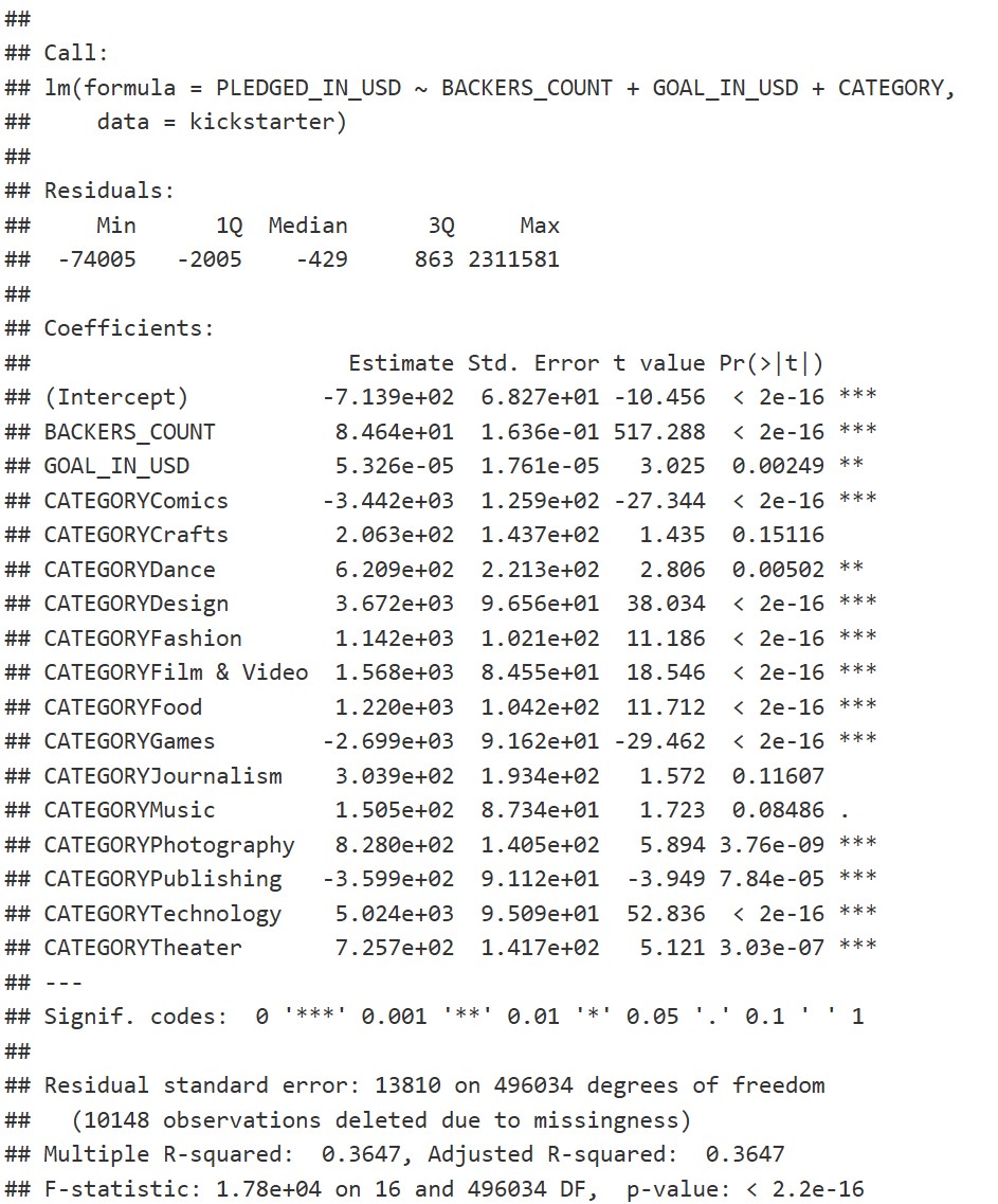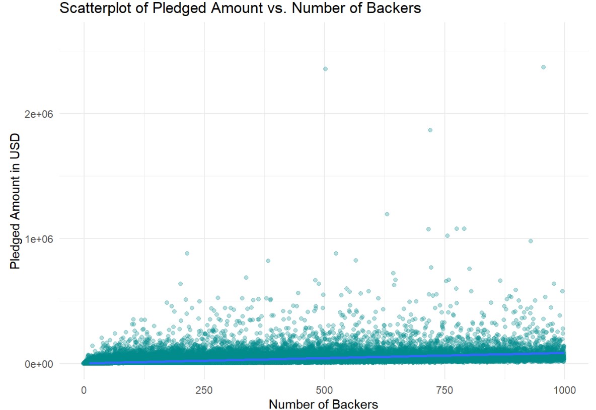 - However, the regression model revealed that while category, number of backers, and funding goals are predictive of the amount pledged, they explain only about 36.47% of the variability, which means unmodeled factors could further influence outcomes. This analysis provides a foundational understanding for potential creators and backers but also suggests the need for deeper investigation into other influential factors not captured in this dataset. Future research could benefit from incorporating qualitative data, like project descriptions and creator backgrounds, to enhance the analysis outcomes.