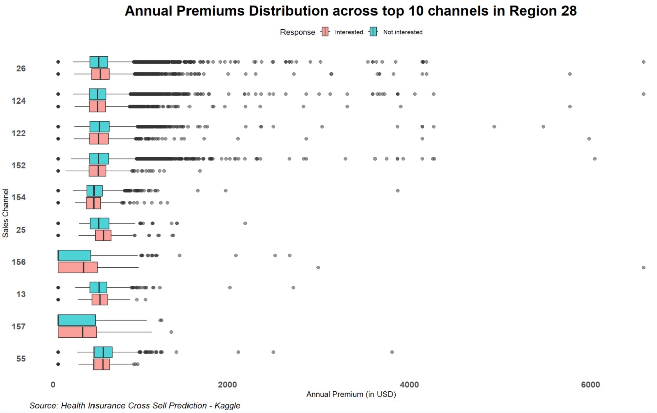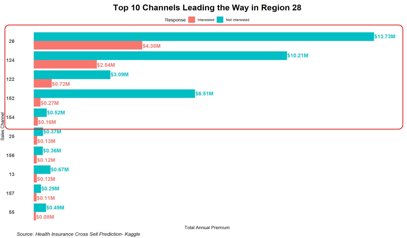 - Where do they should invest in? First, the Region 28 is the top-performing area with the largest interested customer base. Second, the significant no of uninterested customers in this region indicates that our competitors also focus on that region. Also, Region 28 stands out in annual premiums, way more higher than the other regions.